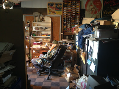 That small room was cluttered with the sort of things with which hoarders fill their places, but also a lot of filing cabinets. There was a path through it to the room in which Tom stayed. It too was cluttered, with a mattress on the floor and posters and papers pinned to the wall. There were stacks of file folders full of movie stills as well as boxes full of well-organized comic books. In the middle of the room was a tripod holding up a hose from which rose an open flame about a foot high that burned constantly. This was his source of light and heat and the explanation for his slightly sooty appearance. “Just like a campfire,” Tom said. “Electricity’s been off for two years.”